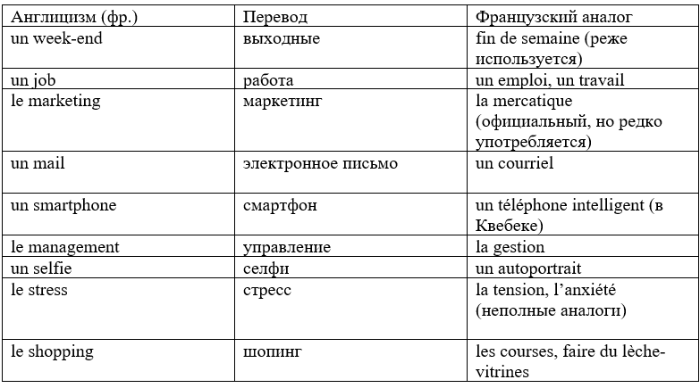 Примеры англицизмов и их французские аналоги:
